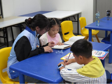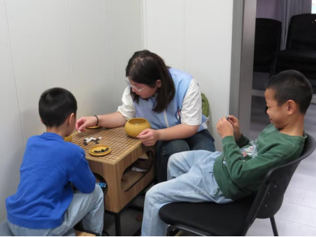 科普环节结束后,志愿者们主动为社区中有作业需要的孩子提供一对一辅导,耐心讲解数学题目,细心指导汉字书写,陪伴他们顺利完成学习任务。作业结束后,大家围坐一起开展五子棋等棋类活动,志愿者与孩子们互动频频,场面温馨融洽。