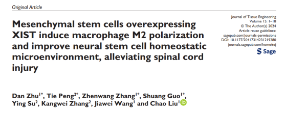 近期,beat365官网朱丹博士以第一作者在国际期刊Journal Of Tissue Engineering(中科院一区,IF:6.7)上发表了题为“Mesenchymal stem cells overexpressing XIST induce macrophage M2 polarization and improve neural stem cell homeostatic microenvironment, alleviating spinal cord injury”的研究成果。该研究发现,通过过表达XIST的BMSCs可以诱导巨噬细胞M2极化,抑制炎症反应,加速NSCs稳态微环境重塑,从而促进损伤区域NSCs分化和轴突形成,最终缓解脊髓损伤。
