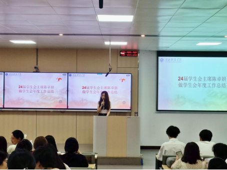 大会在主持人热情洋溢的开场词中拉开帷幕,主持人袁咏怡向大家介绍了出席本次大会的评委和嘉宾,现场气氛庄重而热烈。紧接着,2024届学生会主席陈卓妍上台,做学生年度工作总结。她全面回顾了过去一年学生会在组织各类活动、服务同学、协助学院工作等方面所取得的成绩,同时也客观分析了工作中存在的不足,并对未来学生会工作提出了宝贵的建议。